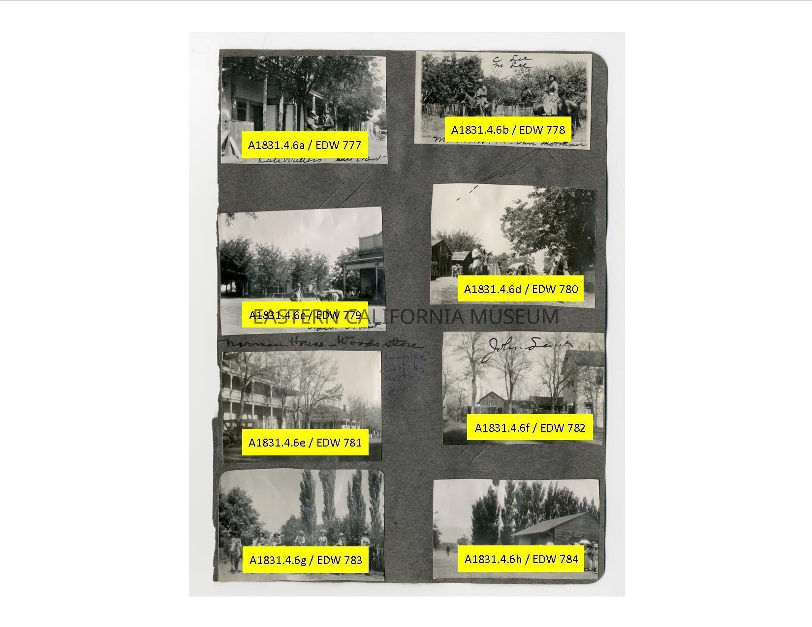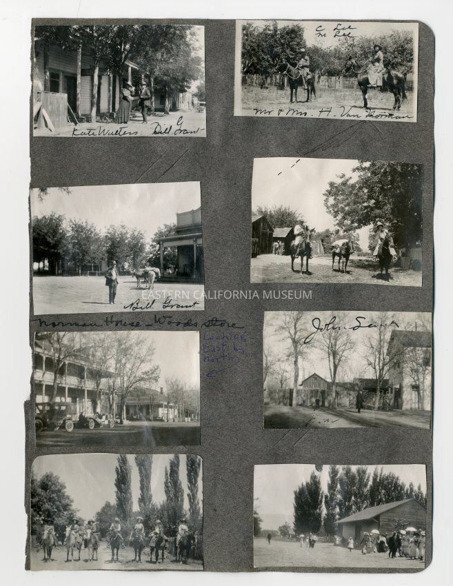 A1831.4.6b: Exterior photo of a man and woman on horseback. They are identified as Mr. and Mrs. H. Van Norman. There is also a notation on the photo of "C. Lee" and "M. Lee."