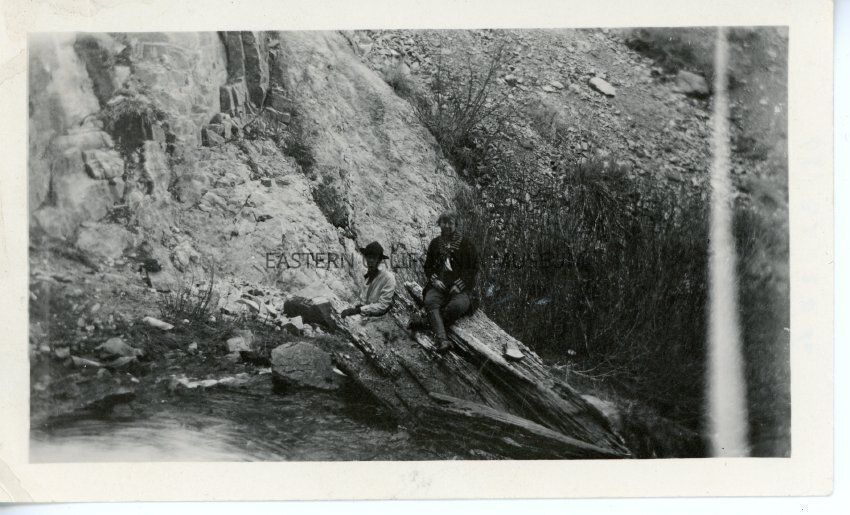Photo of two people sitting on a fallen log or boulder by a river. This photo has a white or light streak on the right side.