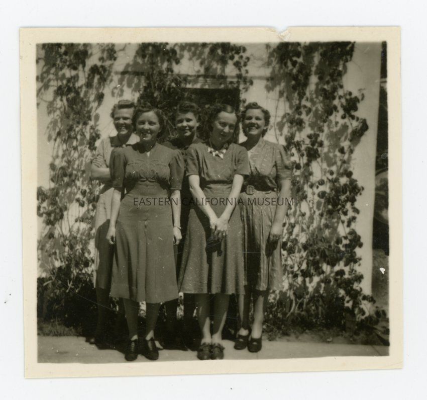 Small photo of five women standing in front of a vine covered building, possibly in Lone Pine.