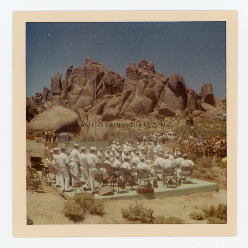 Color photo of a band wearing white military uniforms [US Navy] on a stage in the Alabama Hills.