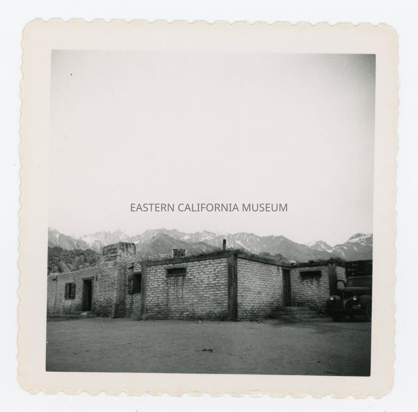 Photo of the exterior of a brick or adobe building with a sign saying "Rawhide Station." Possibly a set for the TV show Rawhide in the Alabama Hills?Collection