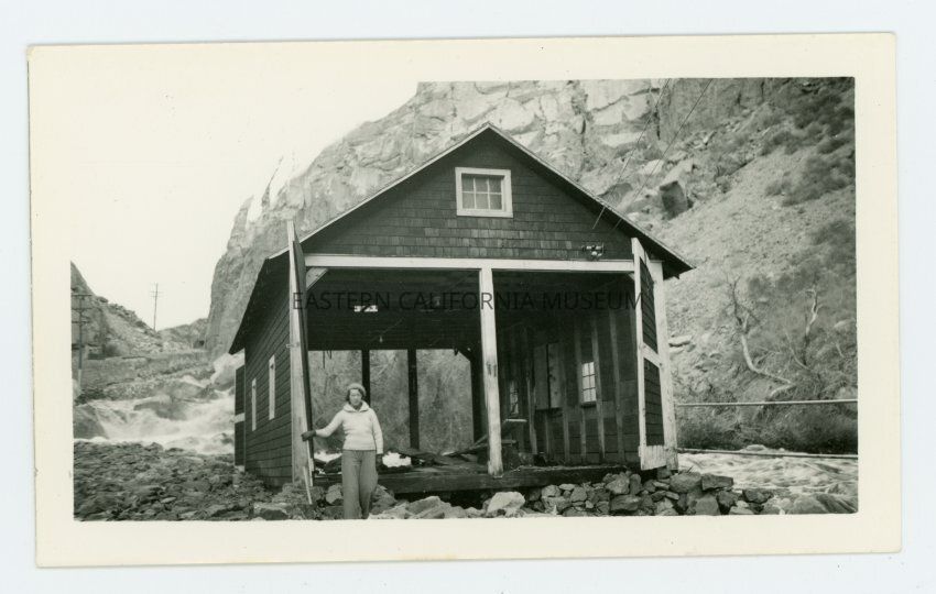 Photo of flood damage to a building in the Owens River Gorge. There is a woman standing in front of the open doors. Photo likely taken by a LADWP employee.Collection