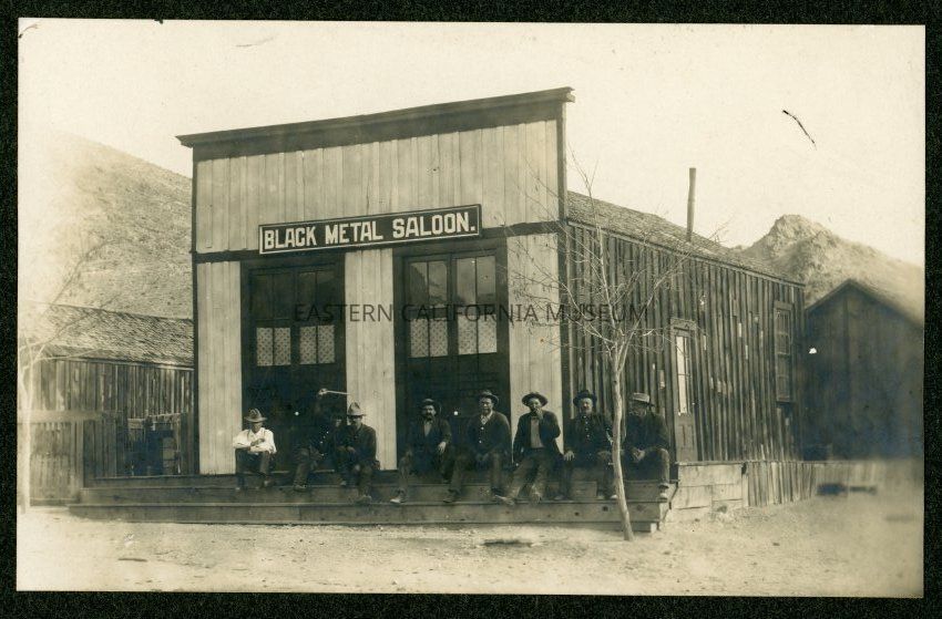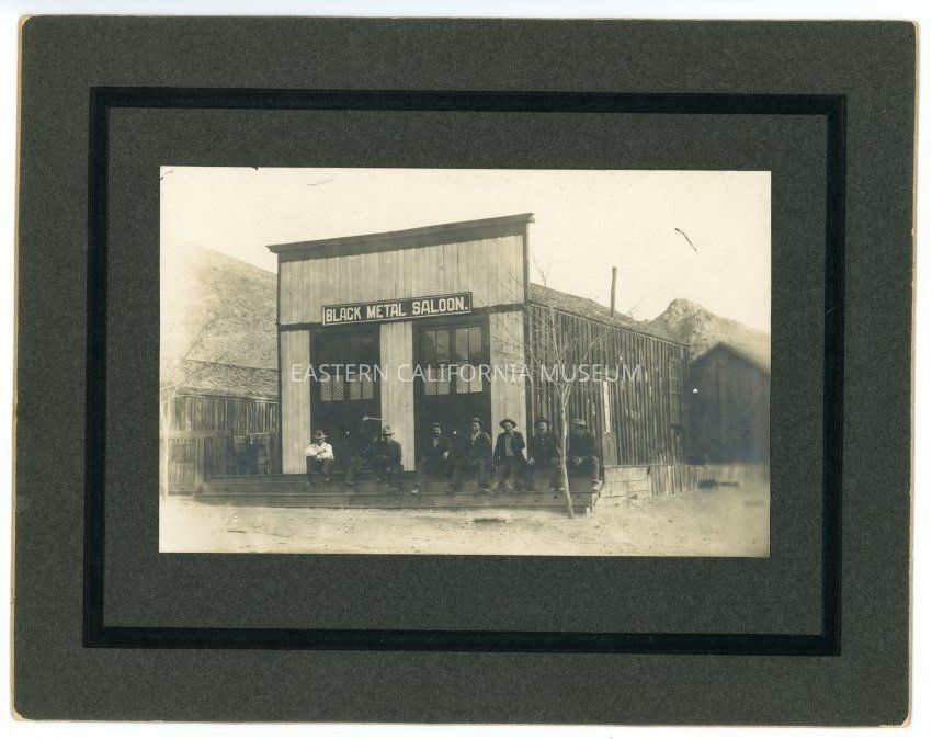 Mounted photo of a group of eight men sitting in front of the Black Metal Saloon in Darwin, CA.