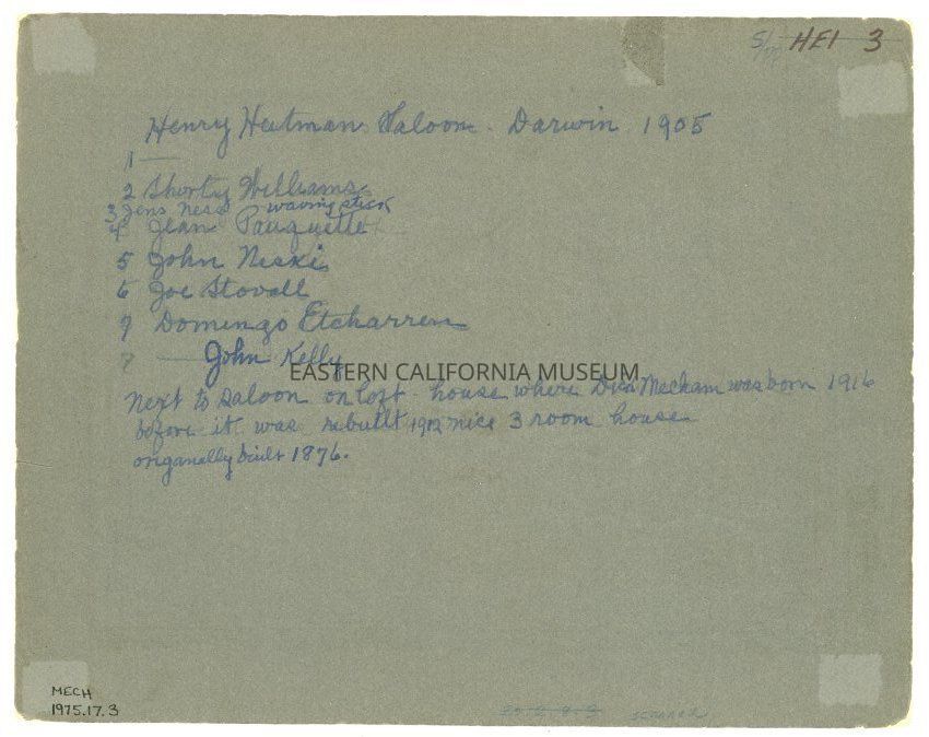 Handwritten on reverse: Henry Heitman Saloon, Darwin, 1905. 1. [unknown], 2. Shorty Williams, 3. Jens Ness waving stick, 4. Jean Pauquette, 5. John Niski, 6. Joe Stovall, 7. Domingo Etcharren, 8. John Kelly. Next to saloon on left house where Dick [Richard] Mecham was born 1916 before it was rebuilt 1912 nice 3 room house, originally built 1876.