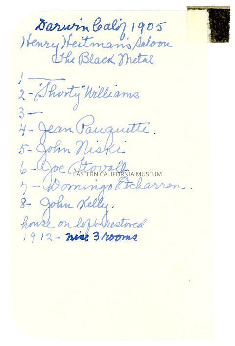 Handwritten on a piece of paper taped to reverse: Darwin, Calif. 1905. Henry Heitman's saloon, the Black Metal. 1. [unknown], 2. Shorty Williams, 3. [unknown], 4. Jean Pauquette, 5. John Niski, 6. Joe Stovall, 7. Domingo Etcharren, 8. John Kelly. House on left restored 1912--nice 3 rooms.Collection