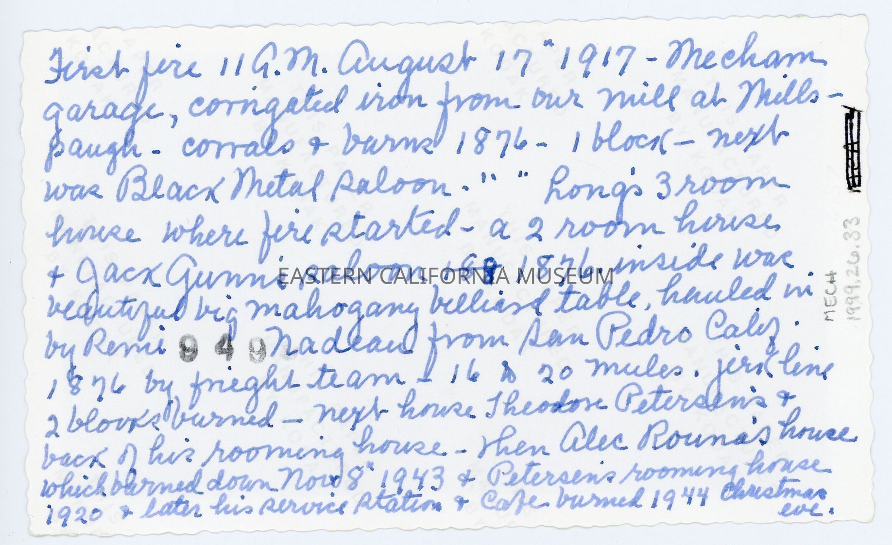Handwritten on reverse: First fire 11 A.M. August 17, 1917. Mecham garage, corrigated iron from our mill at Millspaugh, corrals, and barns 1876--1 block--next was Black Metal Saloon [1876?]. Long's 3 room house where fire started--a 2 room house and Jack Gunn's saloon 1876. Inside was beautiful big mahogany billard table, hauled in by Remi Nadeau from San Pedro, Calif. 1876 by freight team--16 to 20 mules, jerkline. 2 blocks burned--next house Theodore Peterson's [Petersen?] and back of his rooming house--then Alec Rouna's house which burned down Nov. 8, 1943 and Peterson's rooming house 1920 and later his service station and cafe burned 1944 Christmas Eve.Collection