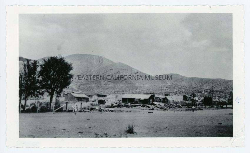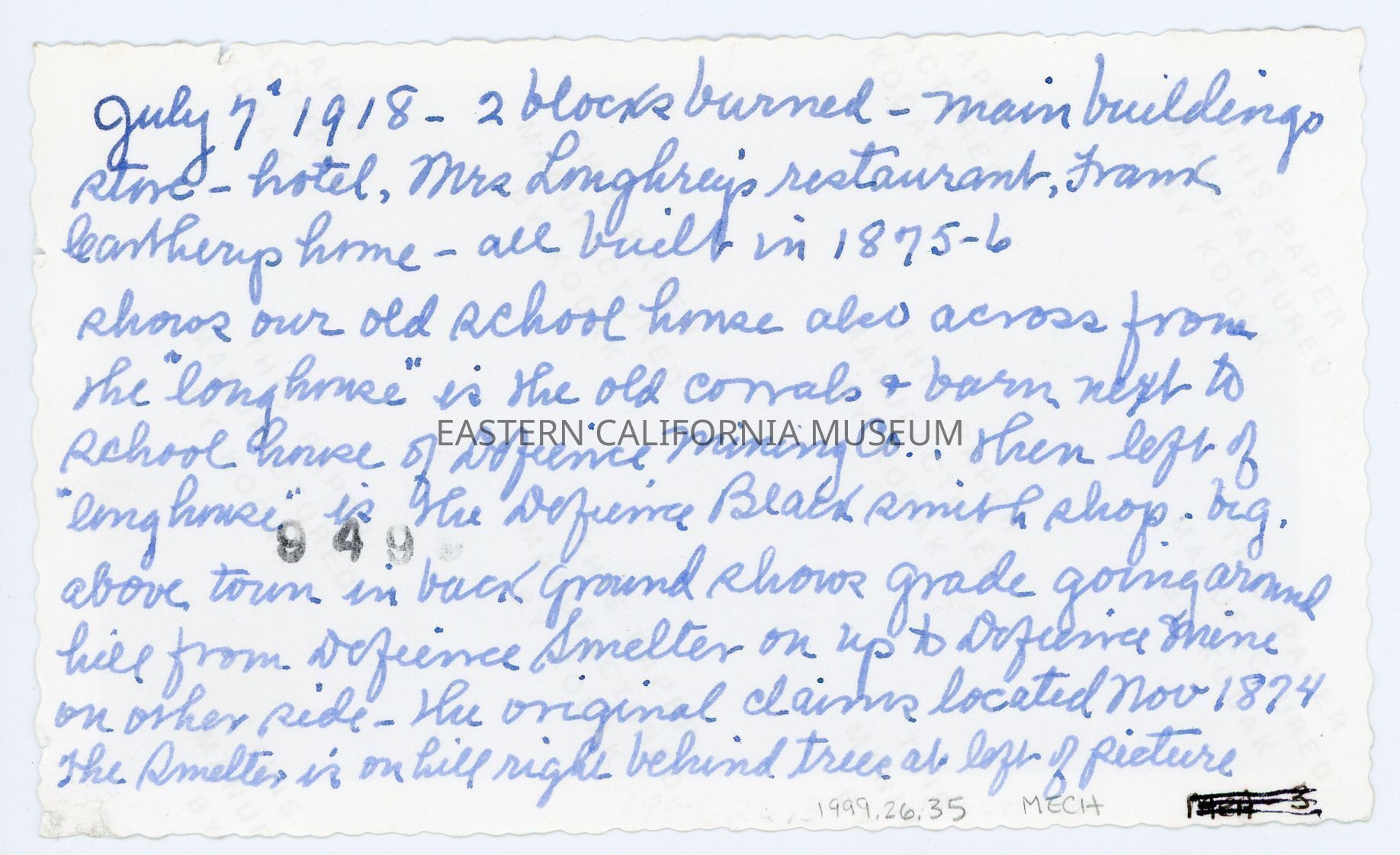 Handwritten on reverse: July 7, 1918. 2 blocks burned--main buildings store--hotel, Mrs. Longhrey's restaurant, Frank Carthery's home--all built in 1875-6. Shows our old school house also across from the "Long house" is the old corrals and barn next to school house of Defiance Mining Co., then left of "Long house" is the Defiance blacksmith shop bldg. Above town in background shows grade going around hill from Defiance Smelter on up to Defiance Mine on other side--the original claims located Nov. 1874. The smelter is on hill right behind tree at left of picture.Collection