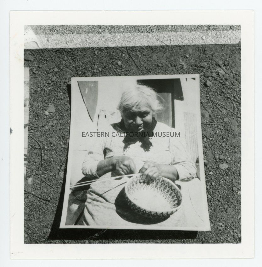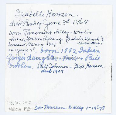 Handwritten on reverse: Isabel Hanson, died Bishop, June 3, 1964, born Panamint Valley, winter home, Warm Springs (Indian Ranch reservation), buried Darwin, Calif. on June 7. Born 1882. Indian George's daughter--Mike and Bill brothers. Bill Johnson--Mike Hanson. Died 1907 [in reference to Bill?]. For museum to keep, 1-19-1978.