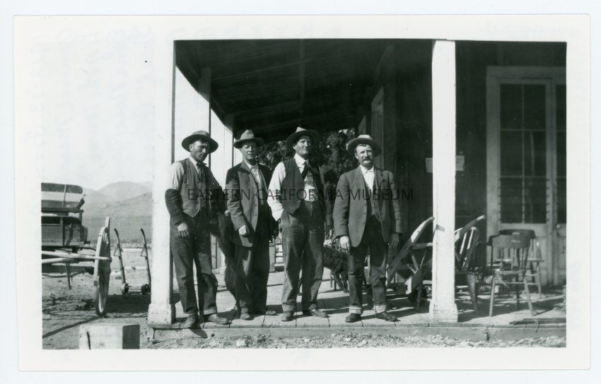 Photo of four men standing on the porch of a store or building.