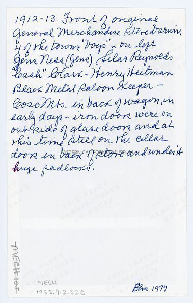 Written in blue ink on reverse: 1912-13. Front of original general merchandise store Darwin. 4 of the town's "boys"--on left Jens Ness, Silas Reynolds, "Cash" Clark, Henry Heitman (Black Metal Saloon keeper). Coso Mts. in back of wagon, in early days iron doors were on outside of glass doors and at this time still on the cellar door in back of store and under it huge padlocks. ELM 1977.
