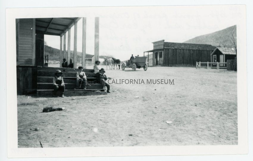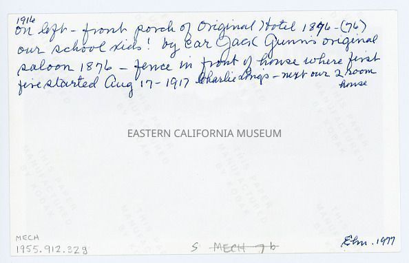 Written in blue ink on reverse: 1916. On left--front porch of original hotel 1876--our school kids! By car jack Gunn's original saloon 1876--fence in front of house where first fire started Aug. 17, 1917 Charlie Long's--next our 2 room house. ELM 1977.