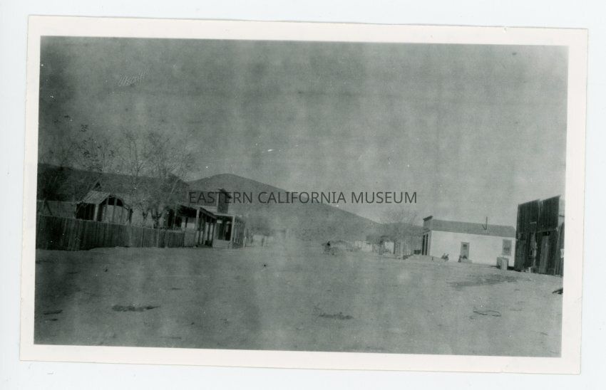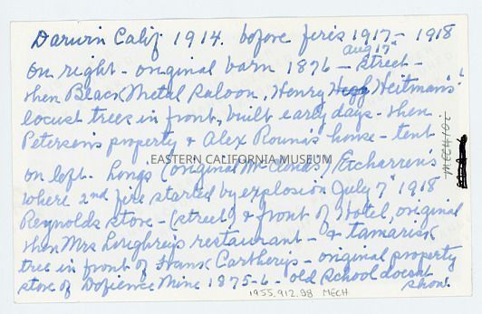 Handwritten in blue ink on reverse: Darwin, Calif., 1914, before fires (August 17) 1917-1918. On right original barn 1876--street--then Black Metal Saloon. Henry Heitman's locust trees in front, built early days--then Peterson's [Petersen?] property and Alex Rouna's house-tent on left. Long's (original McCloud's) Etcharren's where 2nd fire started by explosion July 7, 1918. Reynolds store--(street) and front of hotel, original, then Mrs. Loughrey's restaurant and tamarisk tree in front of Frank Carthery's, original property, store of Defiance Mine 1875-6, old school doesn't show.