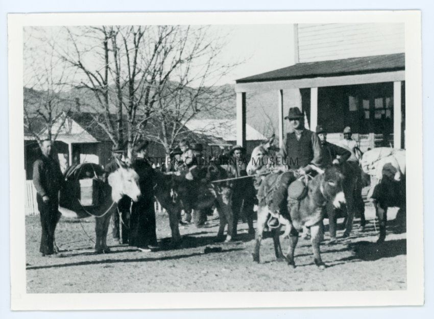 A photocopied paper written by Elizabeth Mecham says: Dec. 12, 1915. John Kelly and pack burros leavingfor Modoc to do assessment work for Hearst. He came down from San Francisco each year to do the work. Then assessment had to be done by Jan 1st. Later years changed to July after World War I. On left Silas Reynolds, Mrs. Etcharren and Ted, 3 yrs. old on jack, miner Mr. Snyder head and hat behind him, Then Martin Etcheverry--Domingo's nephew. Henry Heitman on jack and John Kelly just behind. On porch George Gregory (Indian). All the town about 25 of us always gave Kelly a send off, a great Irishman, a warm day, Darwin's "perfect" climate.