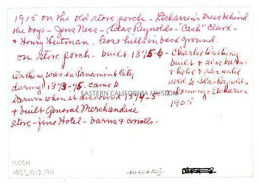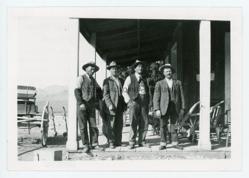 Handwritten in red ink on reverse: 1915 on the old store porch. Etcharrn's trees behind the boys. Jens Ness, Silas Reynolds, "Cash" Clark, and Henry Heitman. Coso hills in background. On store porch built 1875-6 Charlie Anthony built and also barns and hotel and ran until sold to Silas Reynolds and Domingo Etcharren 1905. Anthony was in Panamint City during 1873-75. Came to Darwin when it discovered 1874-5 and built general merchandise store, fine hotel, barns and corrals.