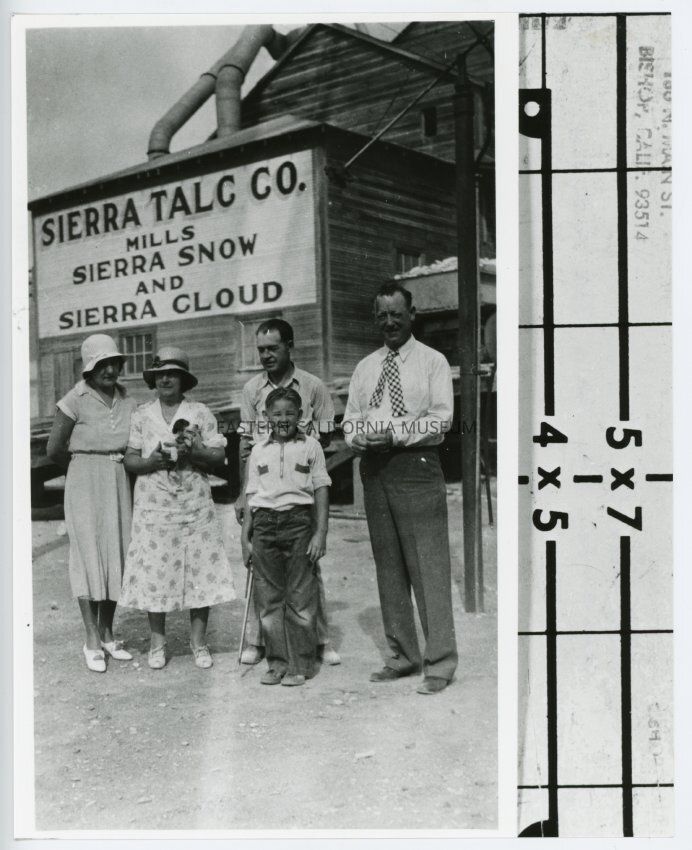 Copy of a photo of five members of the Best family standing by the Sierra Talc Co. building. The large sign behind them says, "Sierra Talc Co. Mills, Sierra Snow, and Sierra Cloud." One of the women is holding a small dog or puppy while the young boy in the front appears to have a small rifle in his right hand.