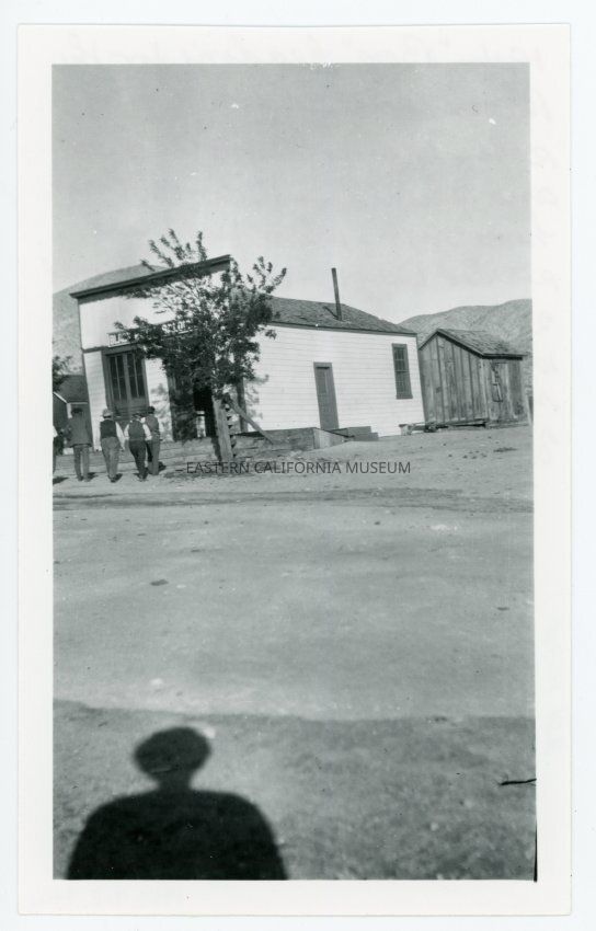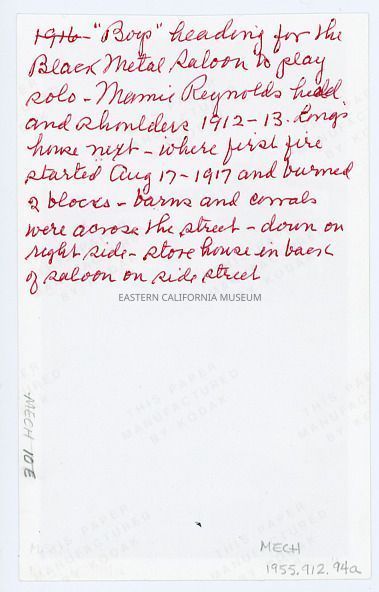 A photocopied paper written by Elizabeth Mecham says: 1915. The gang heading for a solo game--Mamie Reynold's head and shoulders as she took the picture (cut out of this enlargement [reference to 1955.912.94b]). This is the corner where Thorson's store stood--built after 1917 fire by Murry Clay and John Niskey--then Lonnie Lee owned it as a store and P.O. and sold to Bland in 1924 and he sold to Thorson 1928--then 1938 they bought the Out Post from Charlie and Hilda King and the old store burned down in 1945. When these first start no one could get in--we just stood there and watched everything go, as each fire from early days took more of old town--and can do so again!Collection