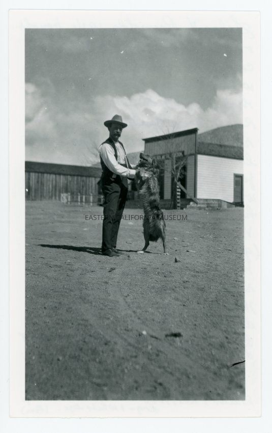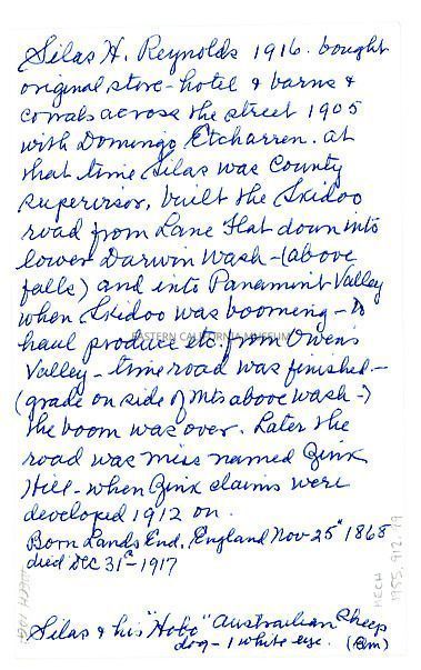 Handwritten in blue ink on reverse: Silas H. Reynolds 1916. Bought original store, hotel, and barns, and corrals across the street 1905 with Domingo Etcharren. At that time Silas was County Supervisor, built the Skidoo road from Lane Flat down into lower Darwin wash (above falls) and into Panamint Valley when Skidoo was booming to haul produce etc. from Owens Valley. Time road was finished (grade on side of mts. above wash) the boom was over. Later the road was misnamed Zink [zinc] Hill when zink [sp] claims were developed 1912 on. Born Lands End, England Nov. 25, 1868, died Dec. 31, 1917. Silas and his "Hobo" Australian sheep dog--1 white eye. ELM.Collection