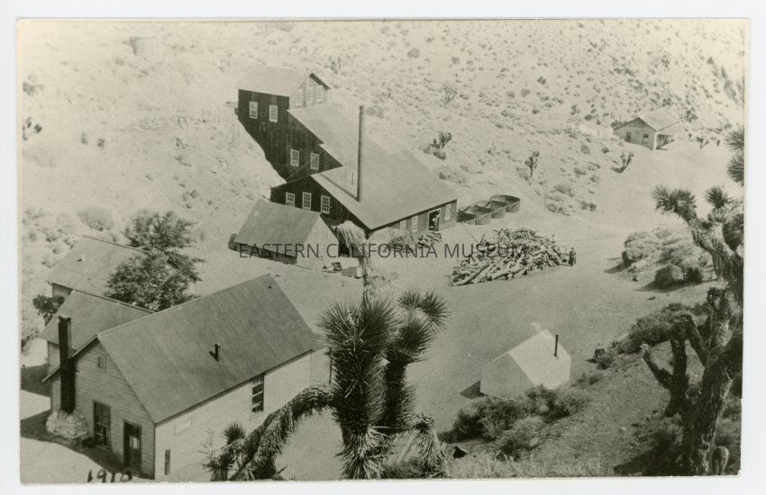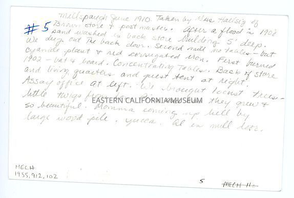 Written in pencil on reverse: Millspaugh June 1910 taken by Gus Haelsig of Brown store and post master. After a flood in 1908 sand washed in back store building 5' deep. We dug out the back door. Second mill no tables--but cyanide plant and red corrugated iron. First burned 1902--bat and board. Concentrating tables. Back of store and living quarters and guest tent at right. Assay office at left. We brought locust trees--little twigs from Lone Pine and how they grew and so beautiful. Momma coming up hill by large wood pile, yucca. Al in mill door.