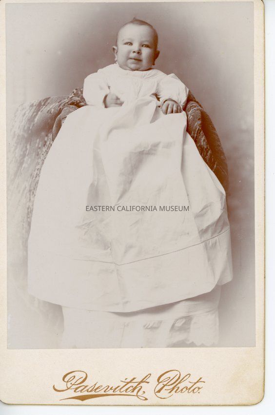 Mounted photo of a baby wearing a long, white dress. The studio stamp says "Pasevitch, Photo." Note on reverse from Eloide Drew says, "This baby looks like Leroy Roeper."