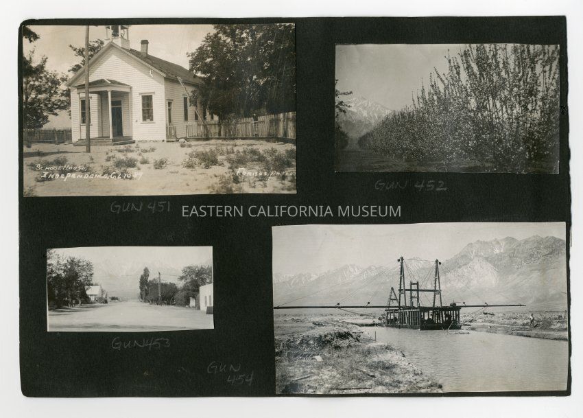 A1831.3.21b: Photo of a blossoming orchard with the Sierra Nevada in the background. Location may be Manzanar and Mt. Williamson.