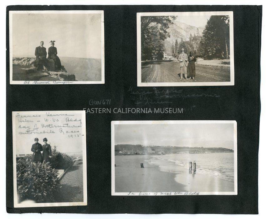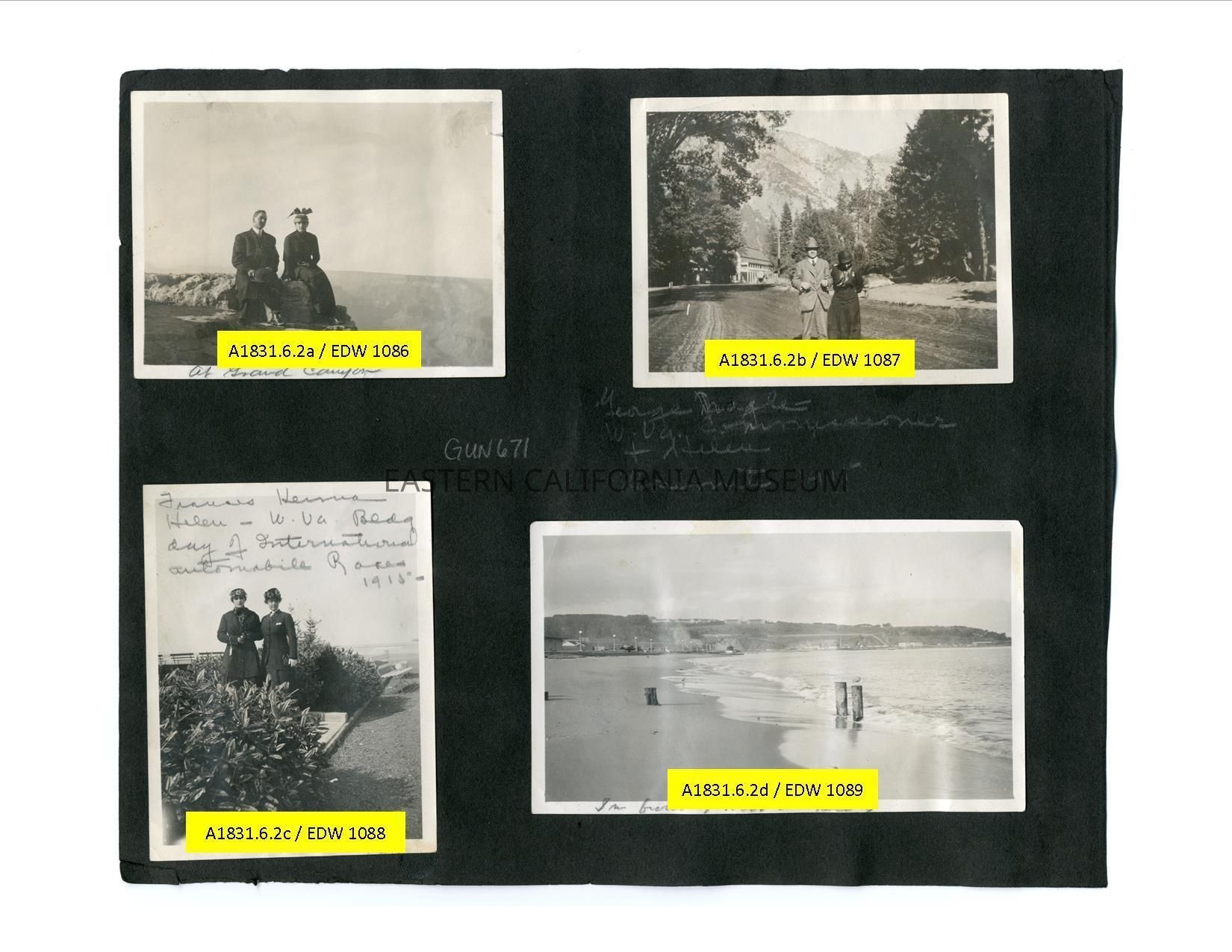 A1831.6.2b: Photo of a man and woman standing in a dirt road with a two story building (hotel?) in the background. Written in pencil on album page below is, "George Nagle [sp?] W. Va. [West Virginia] Commissioner and Helen [Gunn], Yosemite 1915."