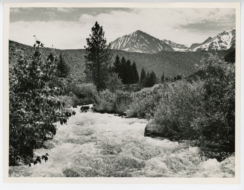 Photo of a rushing river with snow-capped Sierra Nevada in the distance. Maybe McGee Creek, circa 1930? Has "12" handwritten in red pencil on reverse.