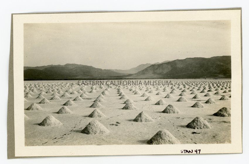 Photo of piles of salt on the salt lake in Saline Valley. Photo taken looking north towards hot springs. The Saline mountain range is on left and the Ubehebe mountain range is on right.Collection