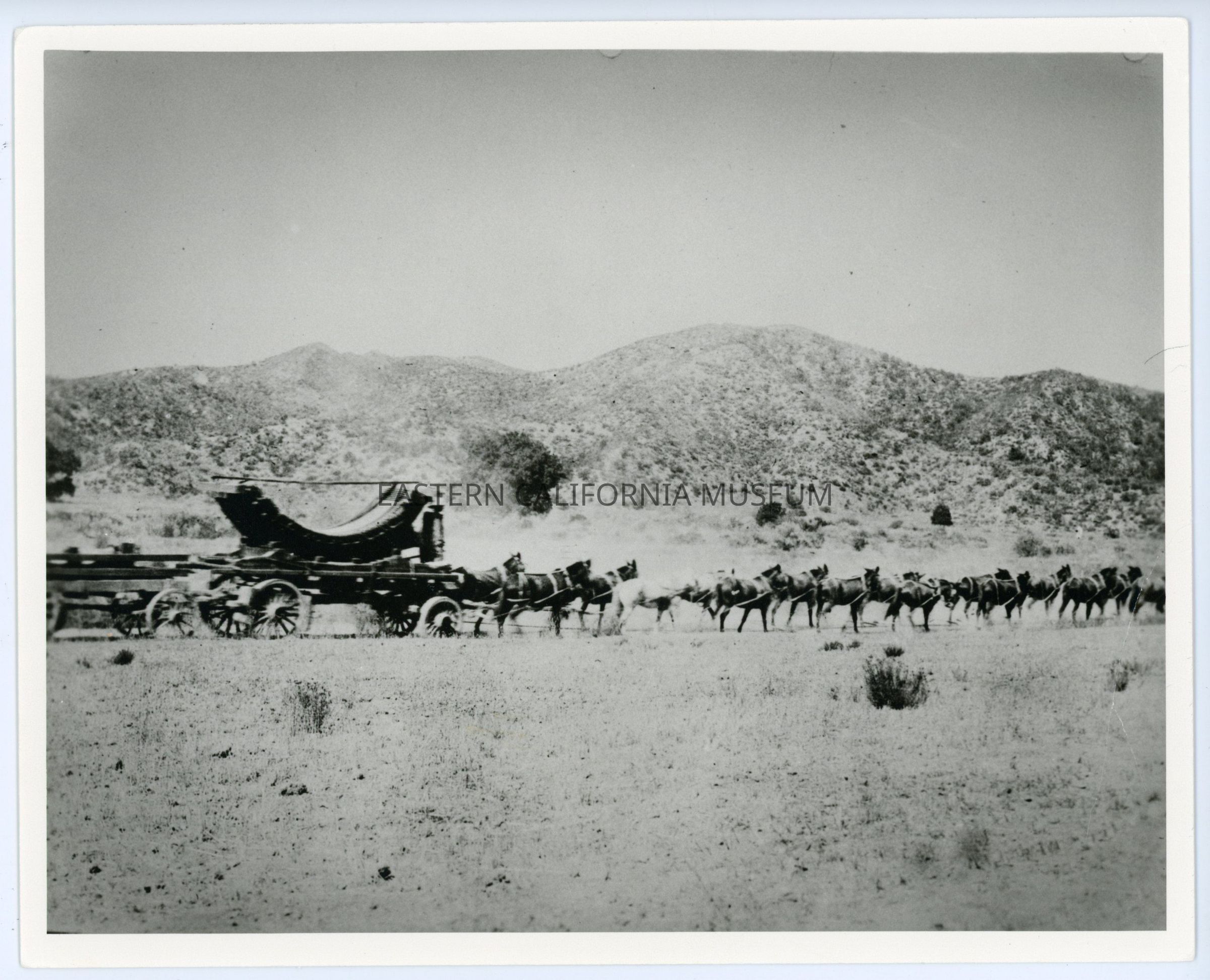 Mules shown hauling a section of power house machinery in the area of San Francisquito Canyon on the southern end of the Los Angeles Owens River Aqueduct.