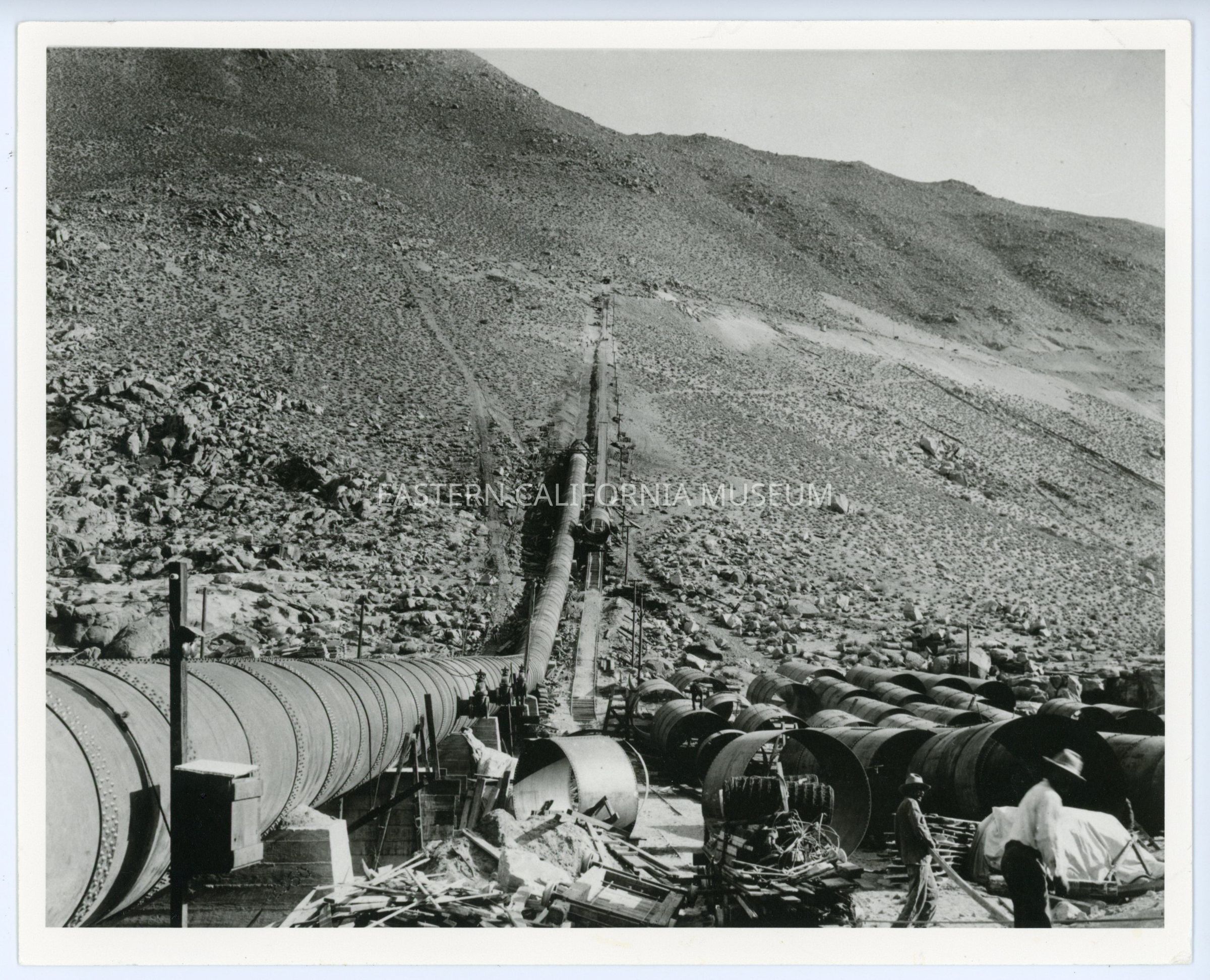 Location may be Nine Mile or No Name Siphon in the Grapevine Division. There are two laborers in the lower right corner with segments of steel pipe behind them.