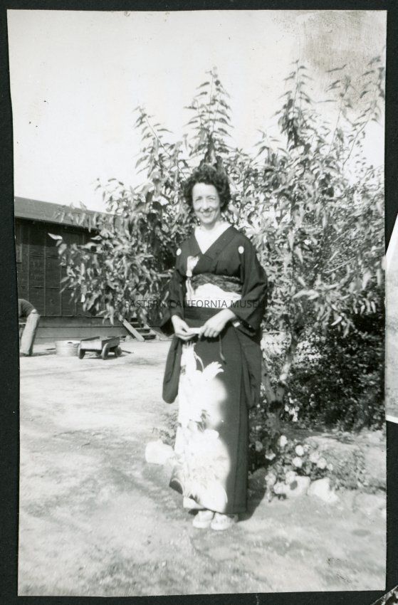 Photograph of Thelma McBride, full-length, facing slightly away from the camera, with hands clasped in front of herself. A Manzanar hospital building can be seen in the background.Collection