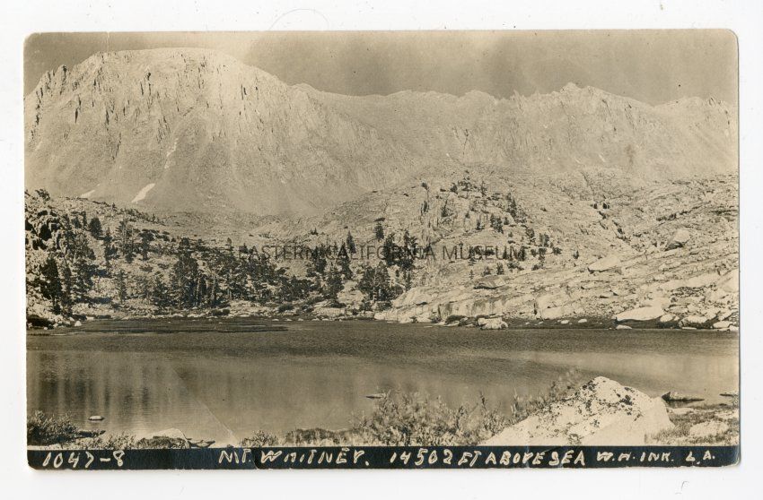 Photograph of a lake and rocky mountains. Writing at bottom says, "1047-8 / Mt. Whitney 14,502 ft. above sea / W. H. Ink. L. A."Collection