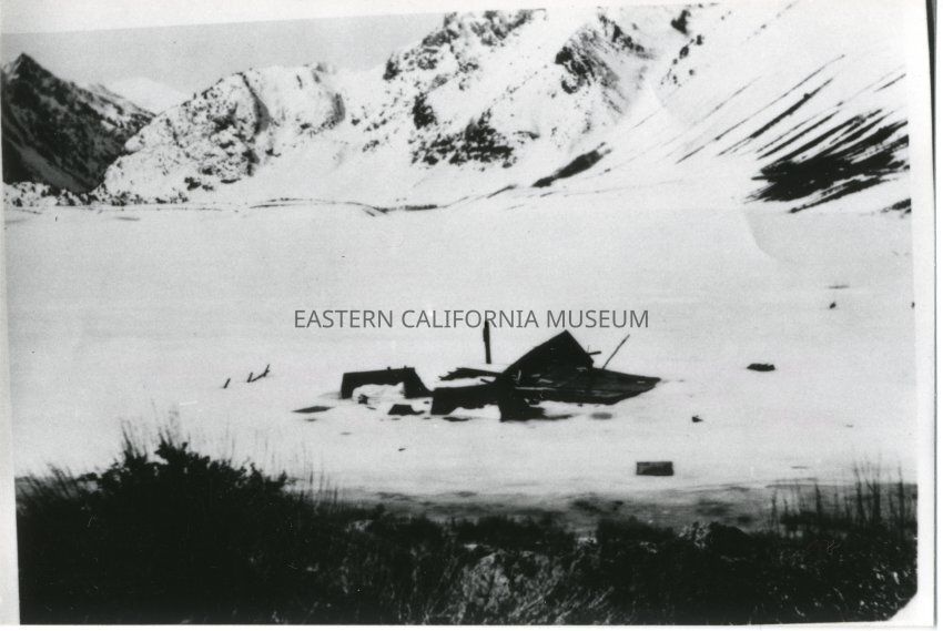 B&W glossy print: appears to be a wrecked cabin, perhaps on the edge of a frozen lake