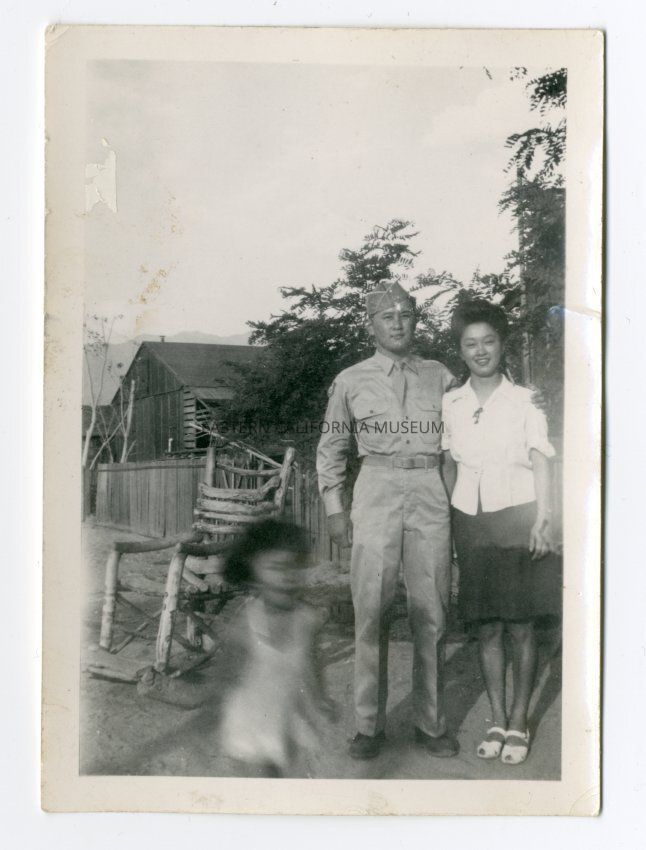 From Louie Sakamoto's photos. Exterior photo of a man and woman standing next to a rocking chair made of wood logs while a little girl (blurry) runs in the foreground. Louie Sakamoto is in a military uniform on the left.Photograph Details