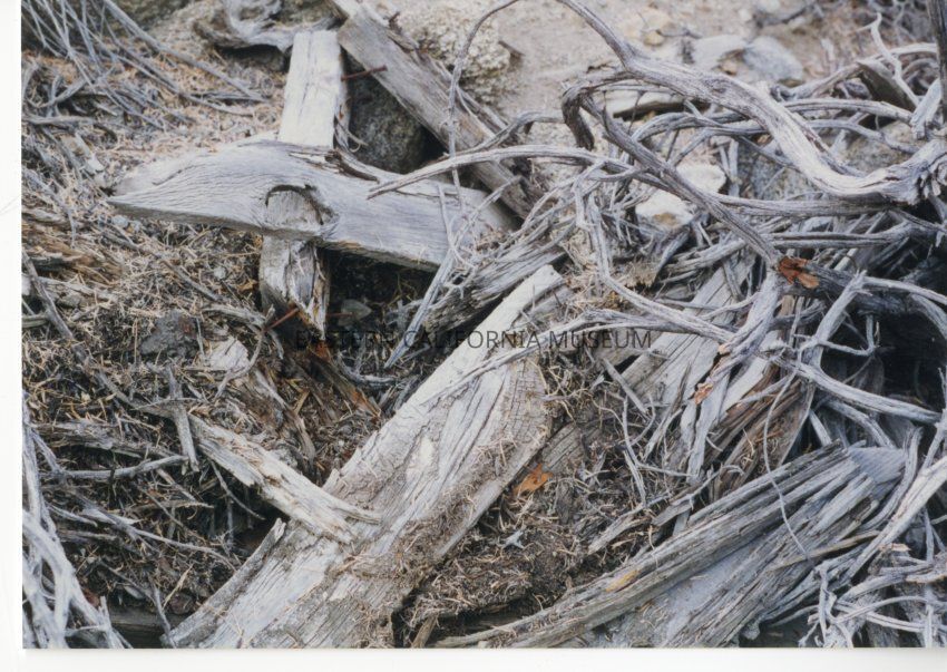 Color. Timber from the flume located on the south side of the creek as it opens into the valley floor, evidence of the logging operation in the Sawmill Creek area.Collection