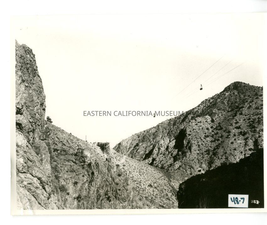 Lavel says: Tramway crossing Daisy Canyon from Control Station No. 2 (left center) to structure 16 (out of view on right). Note line rider standing on bucket in center."