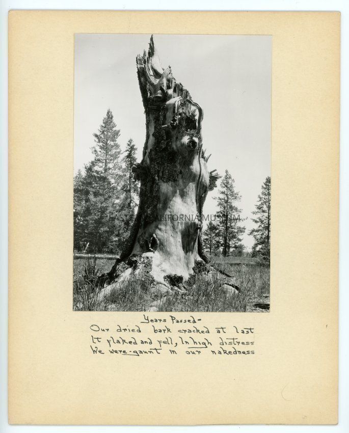 Mounted photo of a tree stump with a poem written beneath it: Years passed Our dried bark cracked at last It flaked anf ell, in high distress We were gaunt in our nakedness