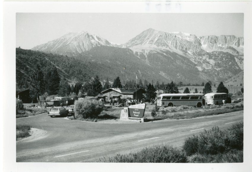 B&W glossy print: Lee Vining Ranger Station, cars and bus in parking lot