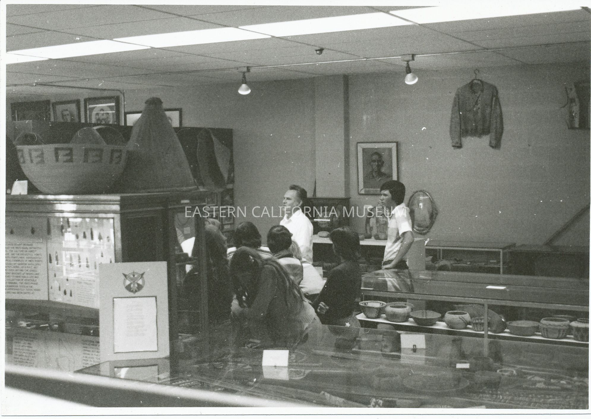 Black and white interior shot of museum of old Native American exhibit with a dark haired man in white shirt near center and a young man (student?) a few feet behind him. Other young people (6) have backs to the camera and are looking at the man. A jacket on a hanger is hanging on the wall near the ceiling (upper right corner of image). Arrowhead display on right with two baskets on top of it.