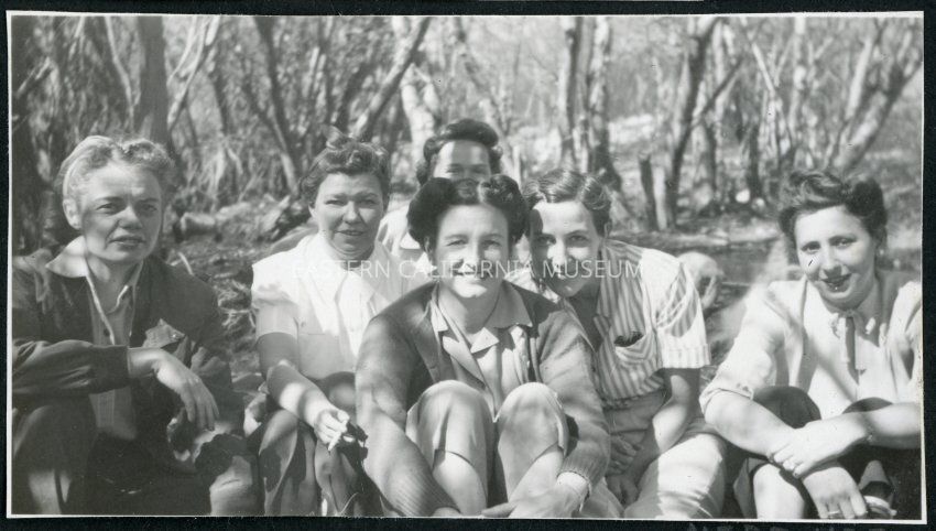 Photograph of a group of six women sitting in front of a stand of trees near Manzanar Incarceration Camp at a hospital staff picnic.Collection