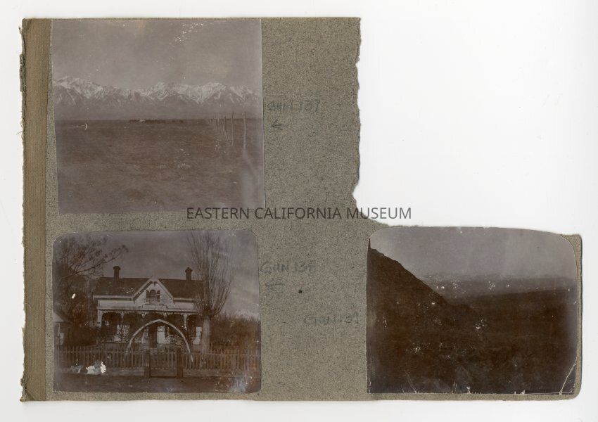 A1831.1.17a: Photo of the Sierra Nevada mountain range with some livestock in the foreground and part of a fence. Location is likely Shepherd's Rach on Georges Creek.