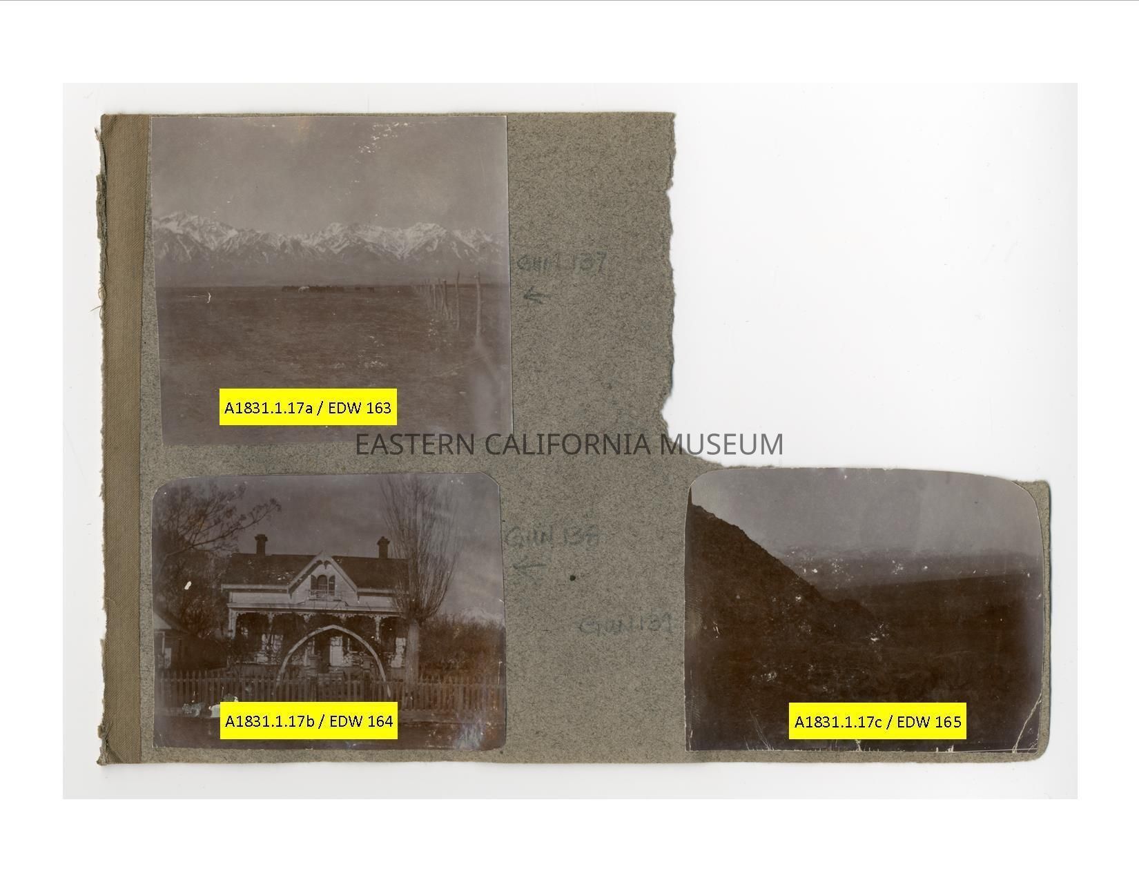 A1831.1.17c: Photo is dark and hard to distinguish, but may be taken from a mine looking west towards Sierra Nevada mountains? There appears to be a stone foundation in the foreground.Collection