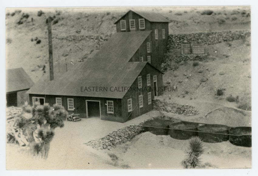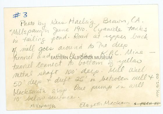 Written in pencil on reverse: Photo by Gus Haelsig, Brown, CA. Millspaugh June 1910. Cyanide tanks in tailing pond. ROad at upper back of mill goes around to the deep tunnel and on to the K.P.C. Mine--tunnel connect to bottom of Yellow Metal shaft 100' deep. Mill well 50' deep and drift 25' in between well and blacksmith shop. One pump in well 10' below surface. Millspaugh. Elizabeth Mecham.Collection