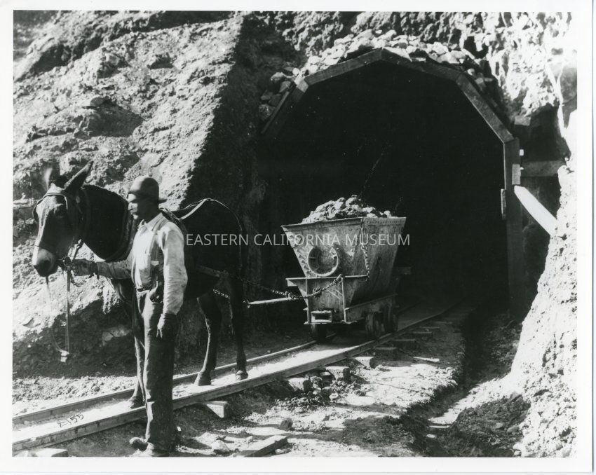 B&W glossy print: man leading a mule that is pulling an ore cart out of a tunnel