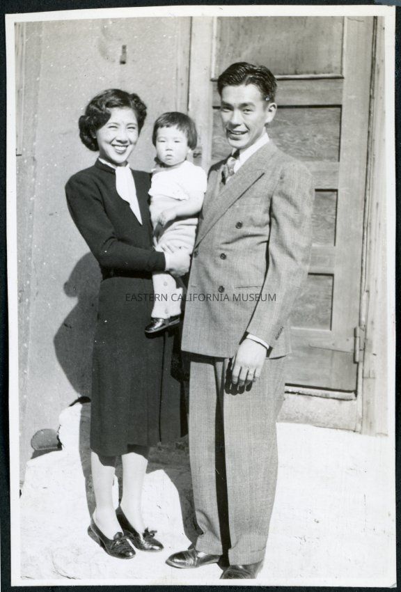 Photograph of Jean and Togo Tanaka with daughter Jeannie posing in front of a door in Cow Creek Camp in Death Valley National Park. Incarcerees were transferred to the former Civilian Conservation Camp after the Manzanar Riot for their own protection.Collection