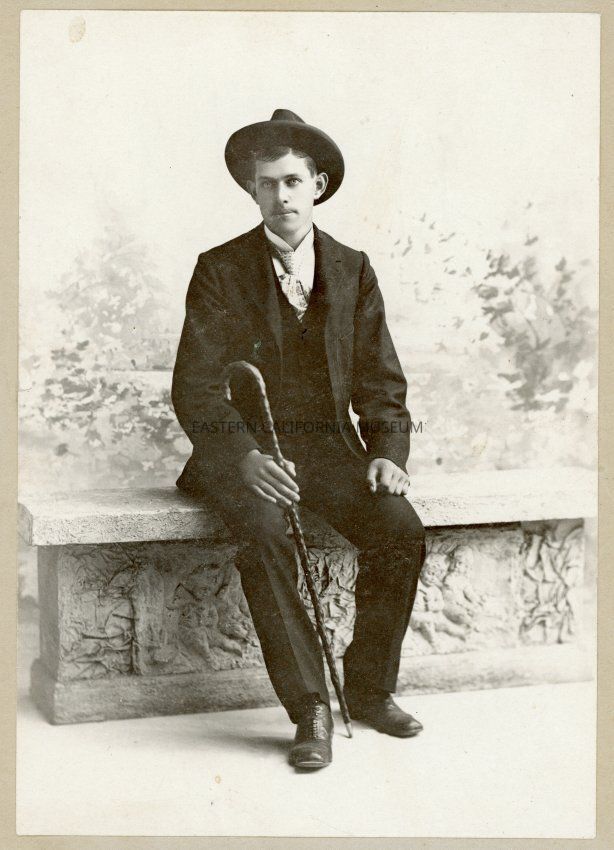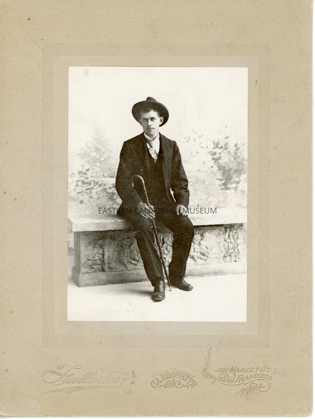 Mounted photo of a man posing for a studio portrait with a cane on a stone bench. The studio information is imprinted in the matting: "Fullerton Photo Co." and "Carbonette" and "1398 Market St., San Francisco, Cal."Made/Created