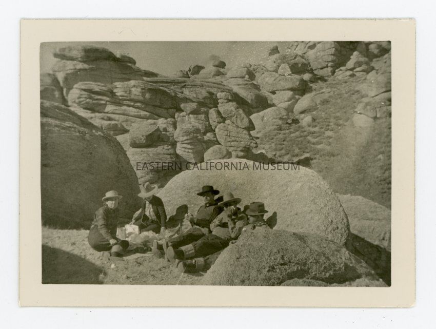 Photo of five people sitting in the Alabama Hills having a picnic.