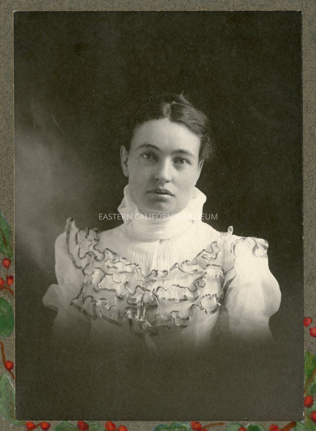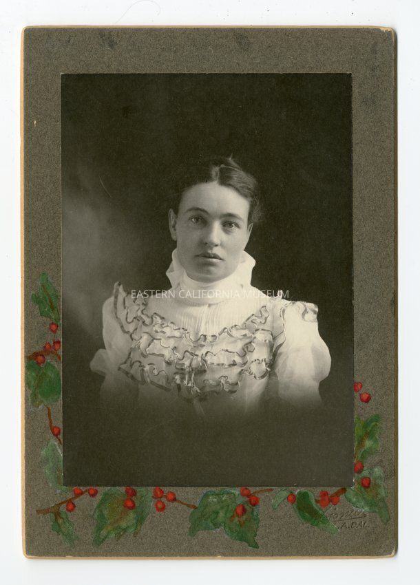 Mounted photograph of Mary Austin in or around 1906. The mounting has hand drawn green leaves and red berries--maybe a Christmas gift? Photographed by Mojonier of Los Angeles.