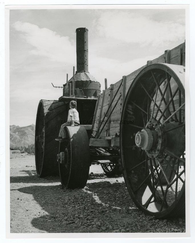 Label on reverse: Abandoned steam tractor for pulling borax wagons, near entrance to Furnace Creek Ranch, 1933.