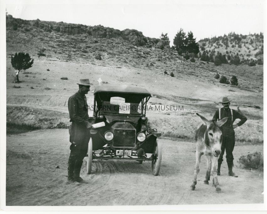 B&W matte print: early model auto with United States Forest Service emblem on front wind shield, possibly a forest ranger standing outside auto, another man with a burro to right of auto