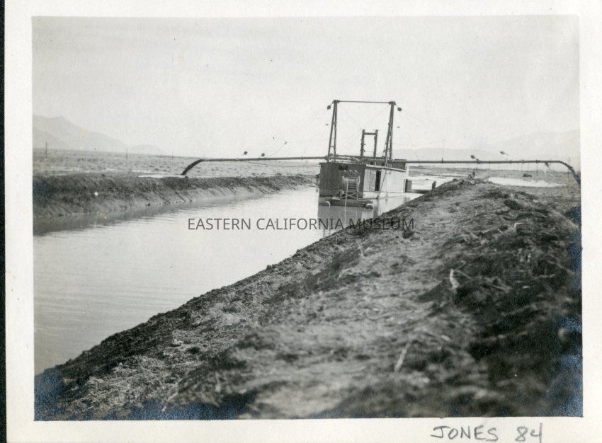 Backside of suction dredge with pipes discharging water and sediment on L.A. Aqueduct.